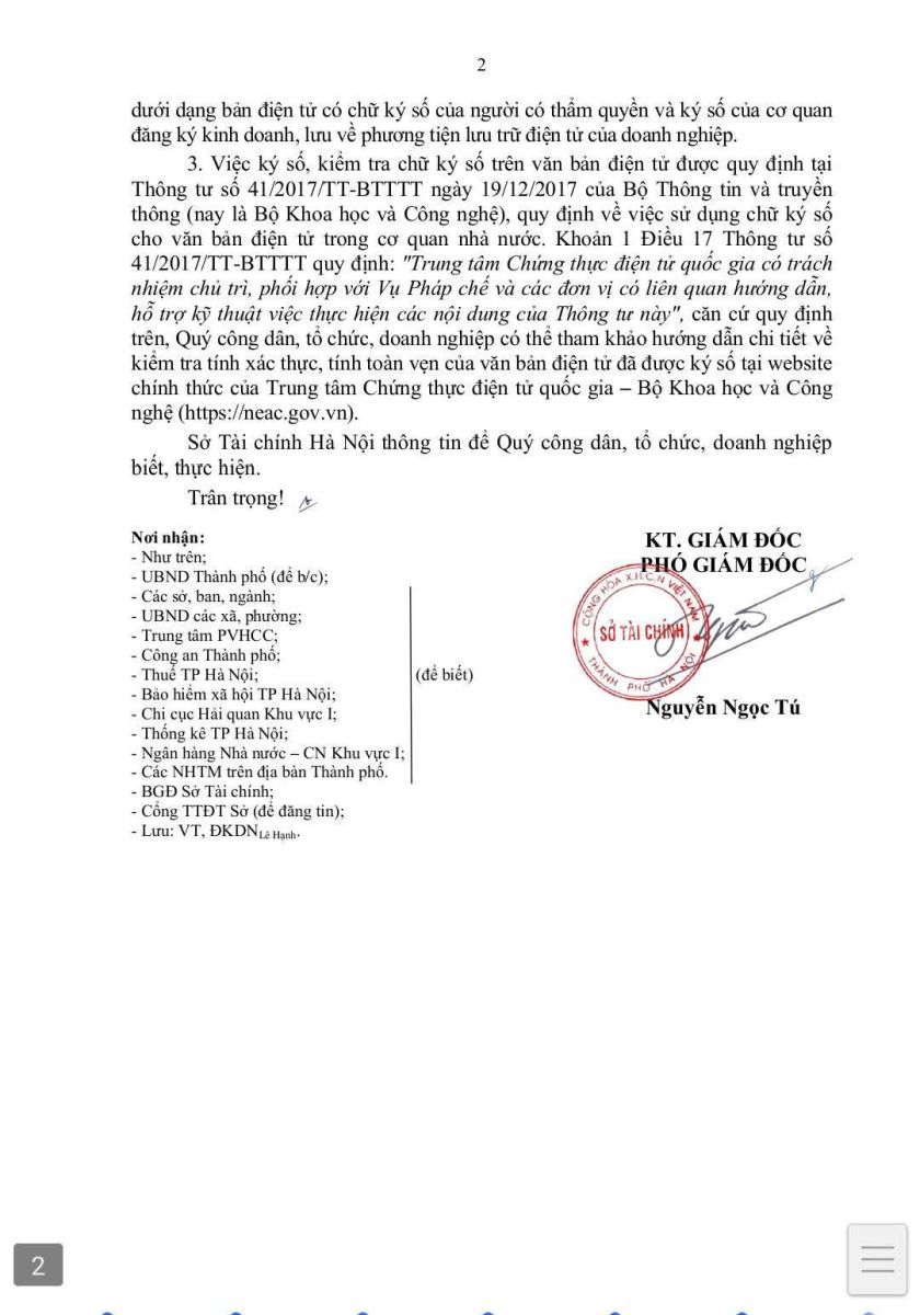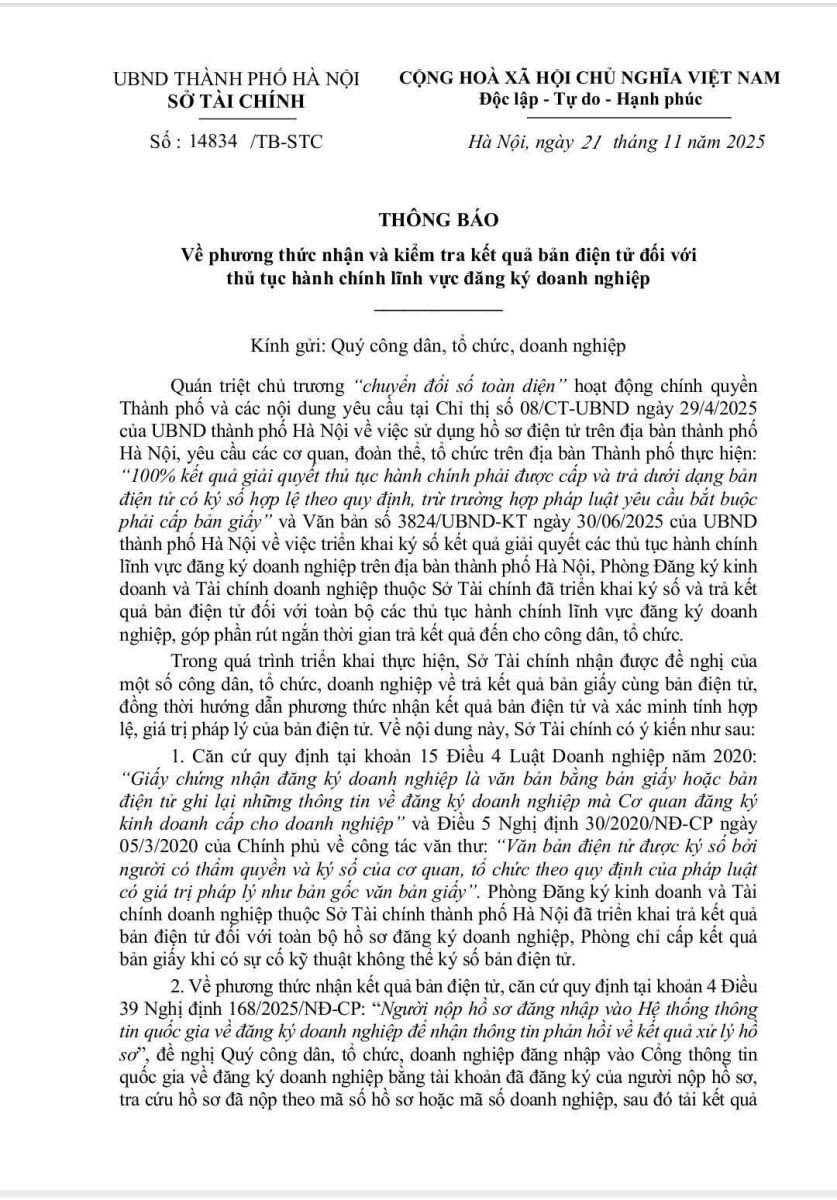 Thông báo của Sở tài chính Hà Nội về phương thức nhận và kiểm tra kết quả bản điện tử đối với thủ tục hành chính lĩnh vực đăng ký doanh nghiệp