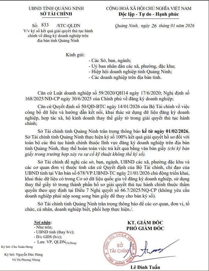Căn cứ Quyết định số 833/STC- QLDN ngày 26/01/2026 của Bộ Tài chính về việc công bố dữ liệu và hướng dẫn kết nối, khai thác sử dụng dữ liệu đăng ký doanh nghiệp, hợp tác xã, hộ kinh doanh thay thế giấy tờ trong giải quyết thủ tục hành chính;Sở Tài chính tỉnh Quảng Ninh trân trọng thông báo kể từ ngày 01/02/2026, Sở Tài chính tỉnh Quảng Ninh thực hiện ký số 100% kết quả giải quyết hồ sơ đối với toàn bộ các thủ tục hành chính thuộc lĩnh vực đăng ký doanh nghiệp trên địa bàn tỉnh Quảng Ninh, thay thế hoàn toàn việc trả kết quả bằng văn bản giấy (chỉ ký bản giấy trong trường hợp xảy ra sự cố kỹ thuật không thể ký số).