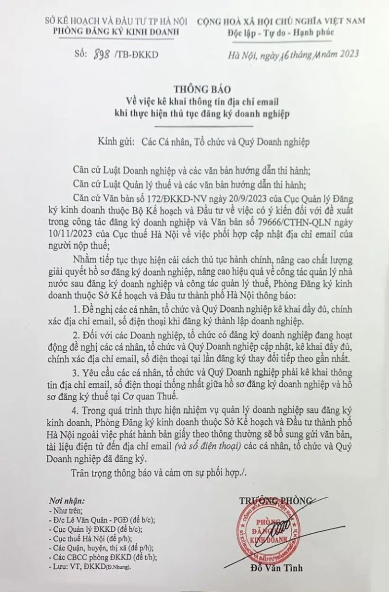 Căn cứ Văn bản số 172/ĐKKD-NV ngày 20/9/2023 của Cục Quản lý Đăng ký kinh doanh thuộc Bộ Kế hoạch và Đầu tư về việc có ý kiến đối với đề xuất trong công tác đăng ký doanh nghiệp và Văn bản số 79666/CTHN-QLN ngày 10/11/2023 của Cục thuế Hà Nội về việc phối hợp cập nhật địa chi email của người nộp thuế;